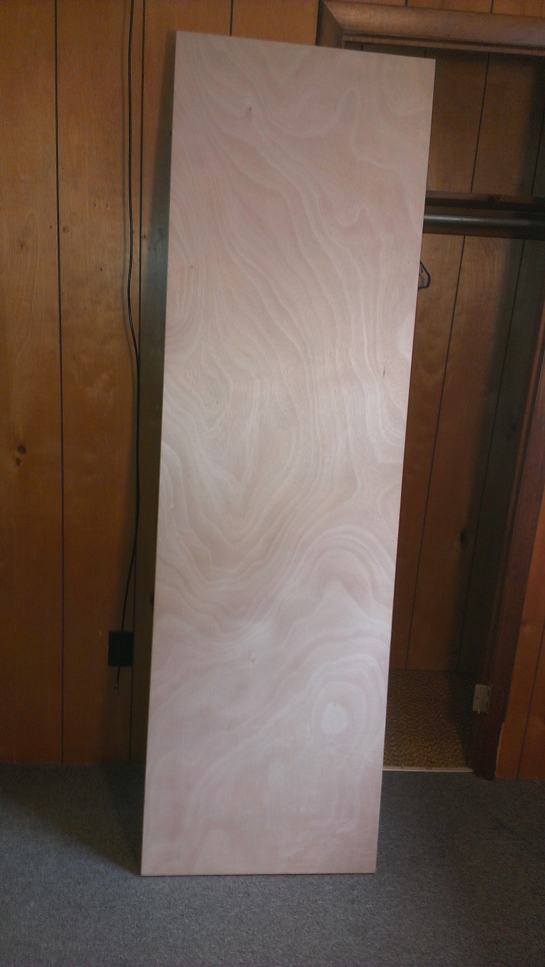 Probably should have stained the door before I hung it, but I was too anxious to see how it would hang. I drilled the nine holes for the hinge screws and hoisted it into the frame, using my toe and the handle of my hammer to level it while I turned the screws.
